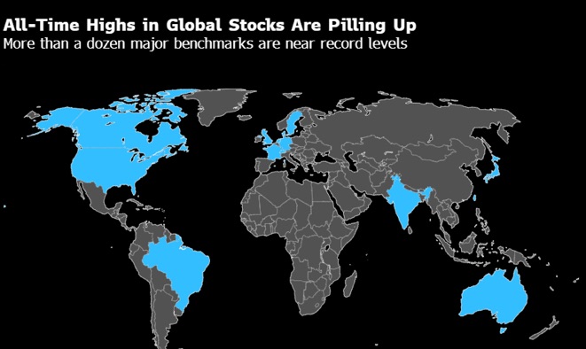 Trong số 20 thị trường chứng khoán lớn nhất thế giới, đã có 14 thị trường ghi nhận mức kỷ lục mới gần đây. Chỉ số MSCI ACWI, theo dõi các thị trường phát triển và mới nổi, đã liên tục thiết lập mức kỷ lục mới, đạt một mức cao mới vào thứ Sáu vừa qua. Tại Hoa Kỳ, các chỉ số S&P 500 và Nasdaq 100 đã ghi nhận các mức kỷ lục trong tuần này, trong khi chỉ số Dow Jones Industrial Average đã vượt qua mốc 40.000 lần đầu tiên trong lịch sử. Trong khi đó, các sàn giao dịch lớn nhất ở châu Âu, Canada, Brazil, Ấn Độ, Nhật Bản và Úc đang ở hoặc gần đạt đỉnh cao của mình.