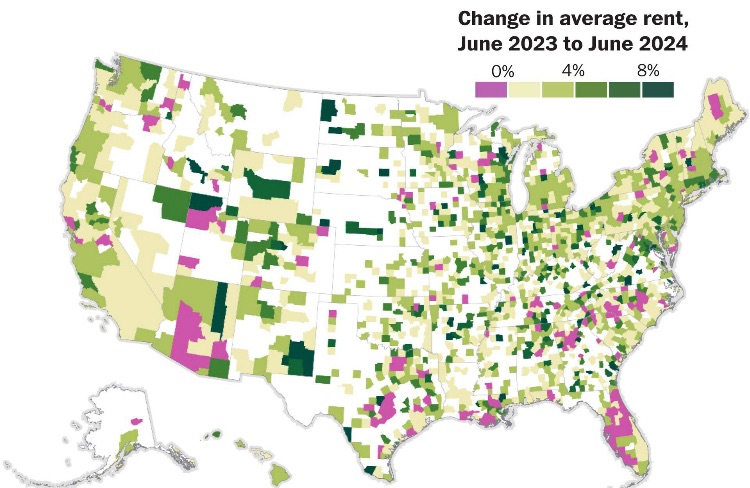 Trong một nửa số quận của Mỹ, mức tăng giá thuê từ tháng 6/2023 đến tháng 6/2024 là nhỏ nhất trong hơn ba năm. Gần ba phần tư các quận có mức tăng nhỏ hơn so với năm trước.