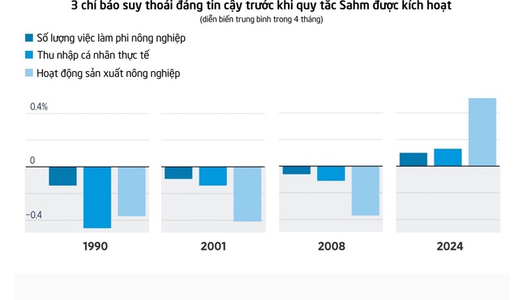 Tỷ lệ thất nghiệp ở Mỹ tăng lên giống như chỉ báo Sahm Rule, chỉ xảy ra trong thời kỳ suy thoái. Tuy nhiên, Sahm Rule không phải là quy tắc định nghĩa suy thoái và không phải là chỉ báo hàng đầu về suy thoái như diễn biến của đường cong lợi suất. Để xác định một cuộc suy thoái, Cục Nghiên cứu Kinh tế Quốc gia Mỹ (NBER) sử dụng ba chỉ báo chính: số liệu việc làm phi nông nghiệp, hoạt động sản xuất công nghiệp và thu nhập thực tế (đã điều chỉnh theo lạm phát). Nếu ba yếu tố này sụt giảm trong bốn tháng liên tiếp, thì suy thoái có thể sẽ xảy ra.