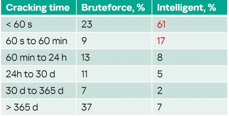 Alexey Antonov, trưởng nhóm nghiên cứu AI tại Kaspersky, cho biết khi đào tạo mô hình AI để phân tích mật khẩu bị rò rỉ, đội ngũ của ông nhận thấy tốc độ bẻ khóa gia tăng đáng kể. Sử dụng phần cứng GPU RTX 4090 và hàm băm MD5 với tốc độ 164 tỷ hash mỗi giây, họ đã bẻ khóa được 61% mật khẩu trong vòng chưa đầy 60 giây và 17% mật khẩu trong 1-60 phút.