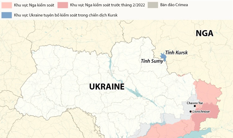 Trong khi đó, Bộ Quốc phòng Nga vào ngày 13/8 thông báo rằng quân đội của họ đã đẩy lùi các nỗ lực tấn công của Ukraine tại tỉnh Kursk, ngăn chặn các nhóm xung kích Ukraine sử dụng thiết giáp để tiến sâu vào một số khu dân cư. Họ cũng cho biết không quân và lực lượng tên lửa Nga đã tấn công các vị trí dự bị của Ukraine tại tỉnh Sumy bên kia biên giới.