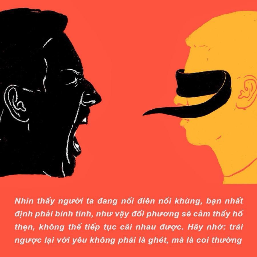 - Nhìn thấy người ta đang nổi điên nổi khùng, bạn nhất định phải bình tĩnh, như vậy đối phương sẽ cảm thấy hổ thẹn, không thể tiếp tục cãi nhau được. Hãy nhớ: trái ngược lại với yêu không phải là ghét, mà là coi thường.